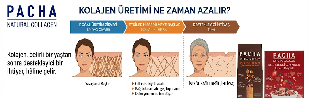 Bilimsel olarak vücudun doÄŸal kolajen üretimi 25 yaÅŸ civarında yavaÅŸlamaya baÅŸlar. Ancak bu düÅŸüÅŸün etkileri genellikle 30’lu yaÅŸların ortalarından itibaren daha net hissedilir.